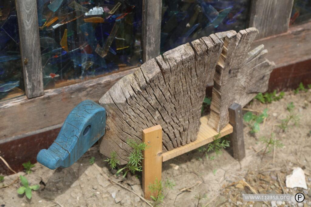 Drewniane zabawki i rzeźby ogrodowe, podpórki na rośliny.