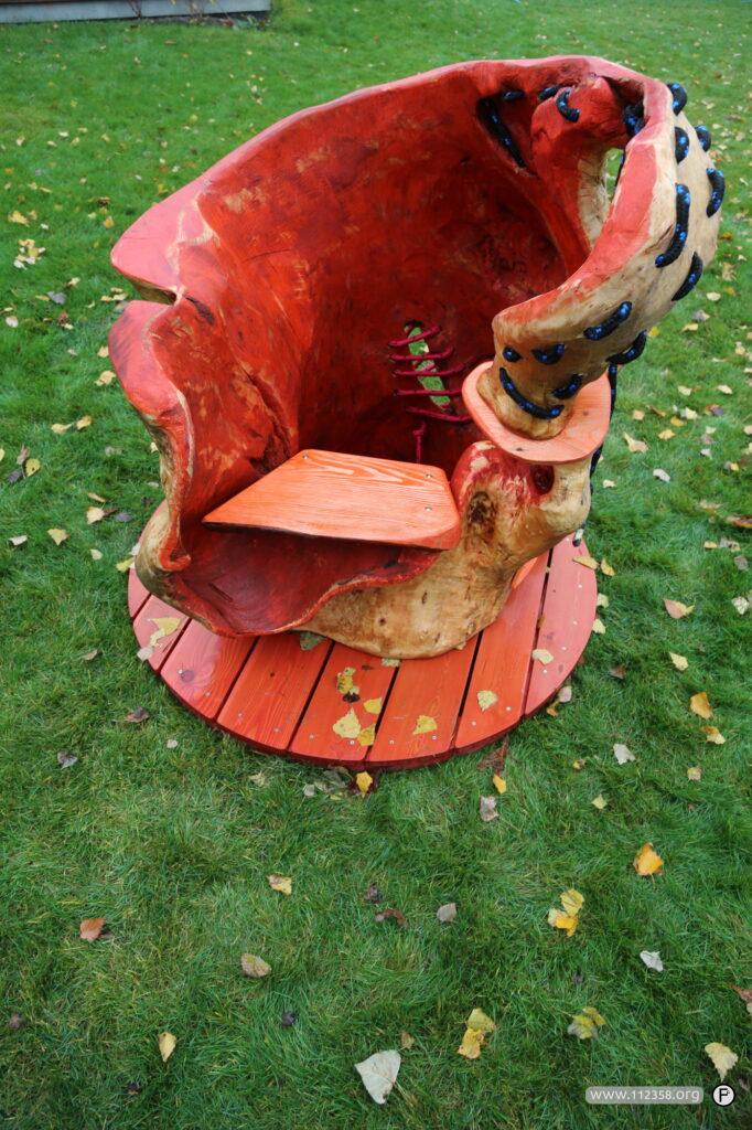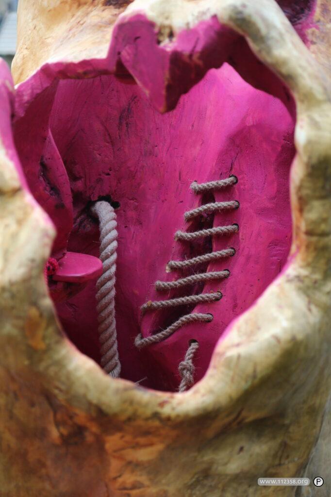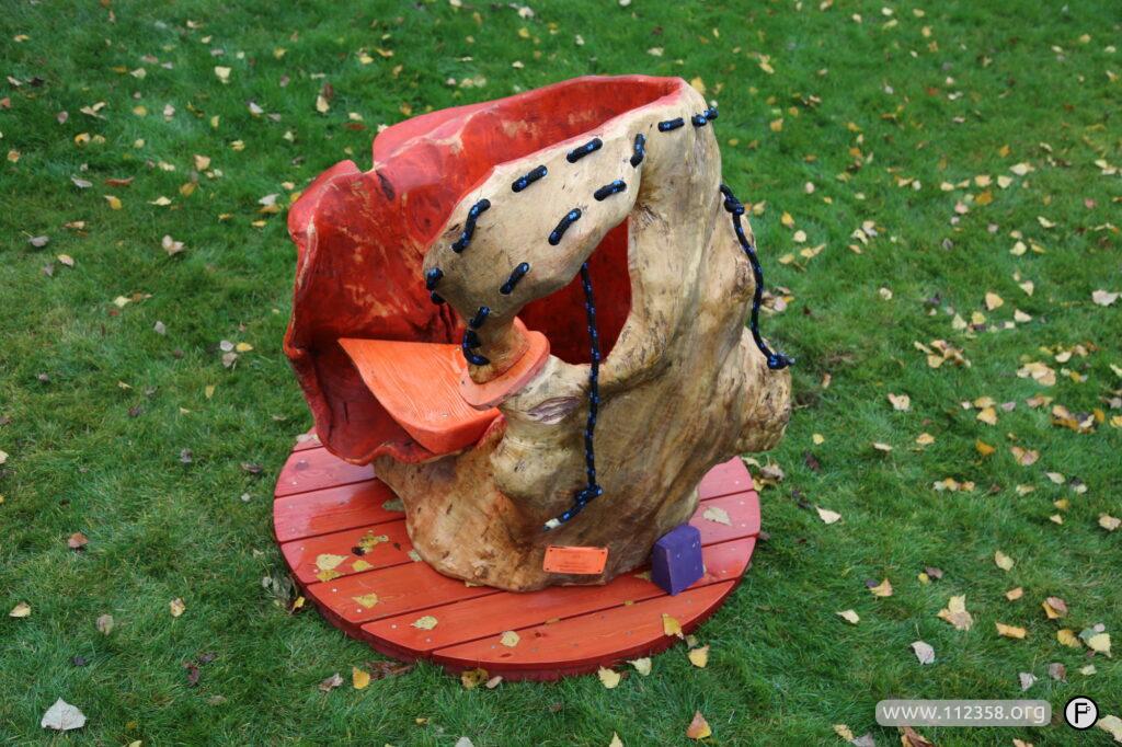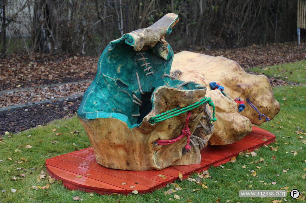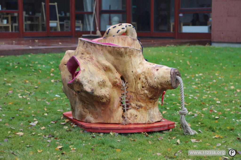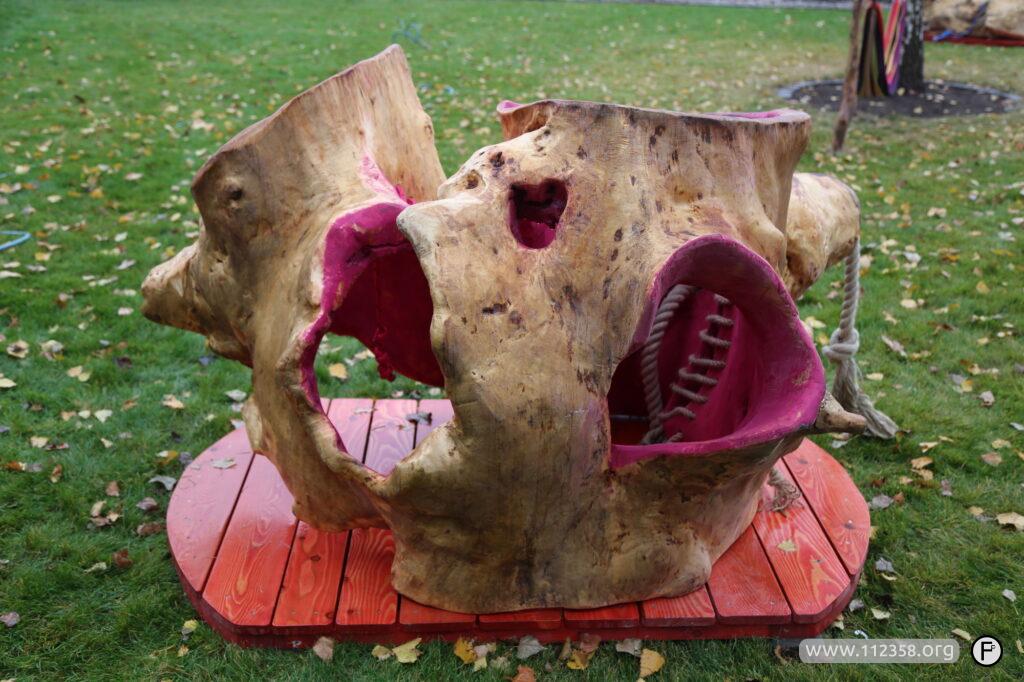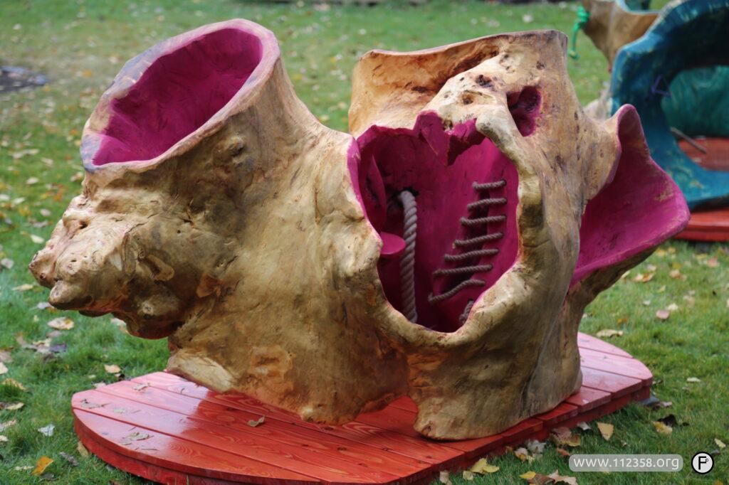 Puste pniaki i korzenie przerobione na tunele i inne abstrakcyjne zabawki na plac zabaw.