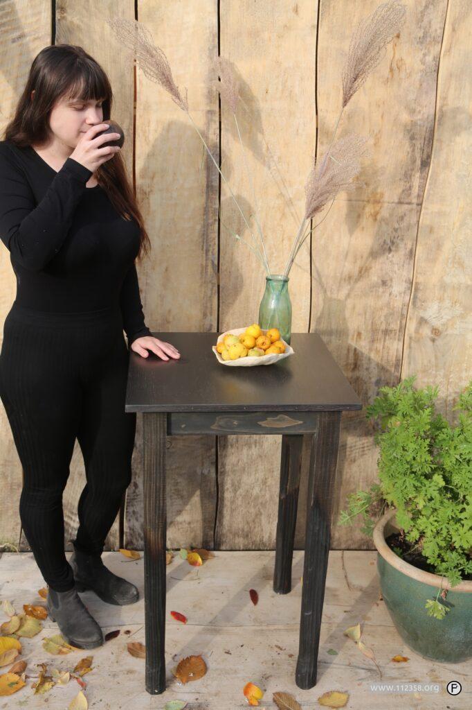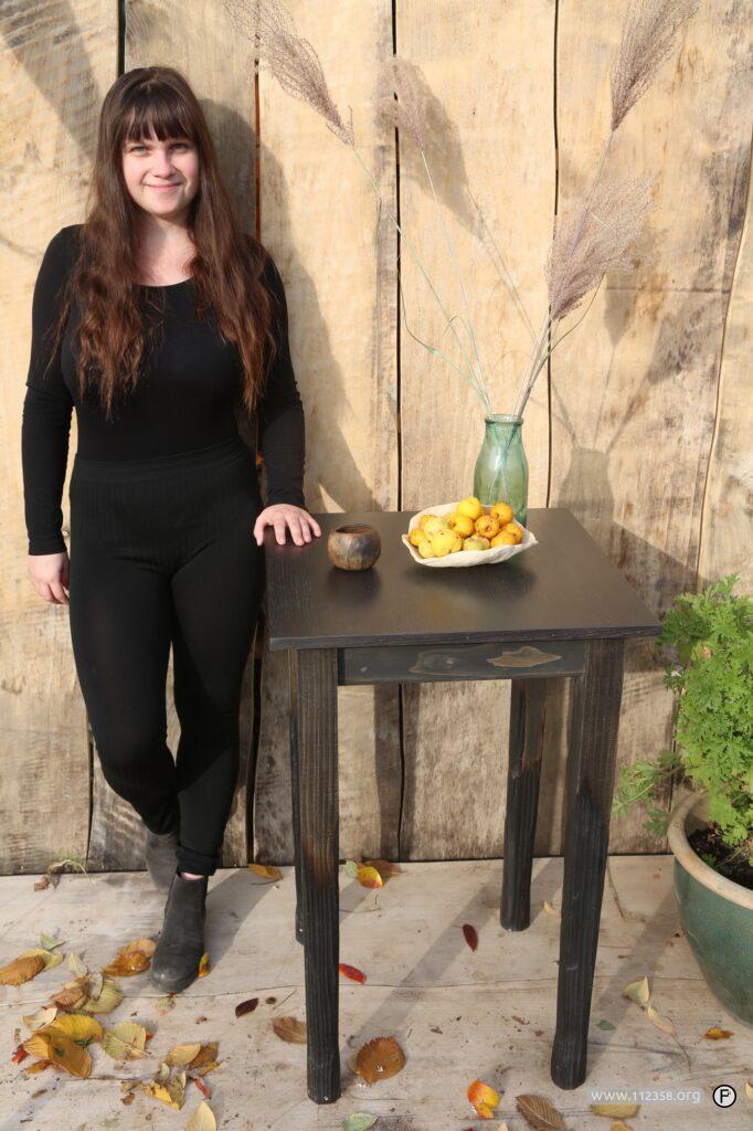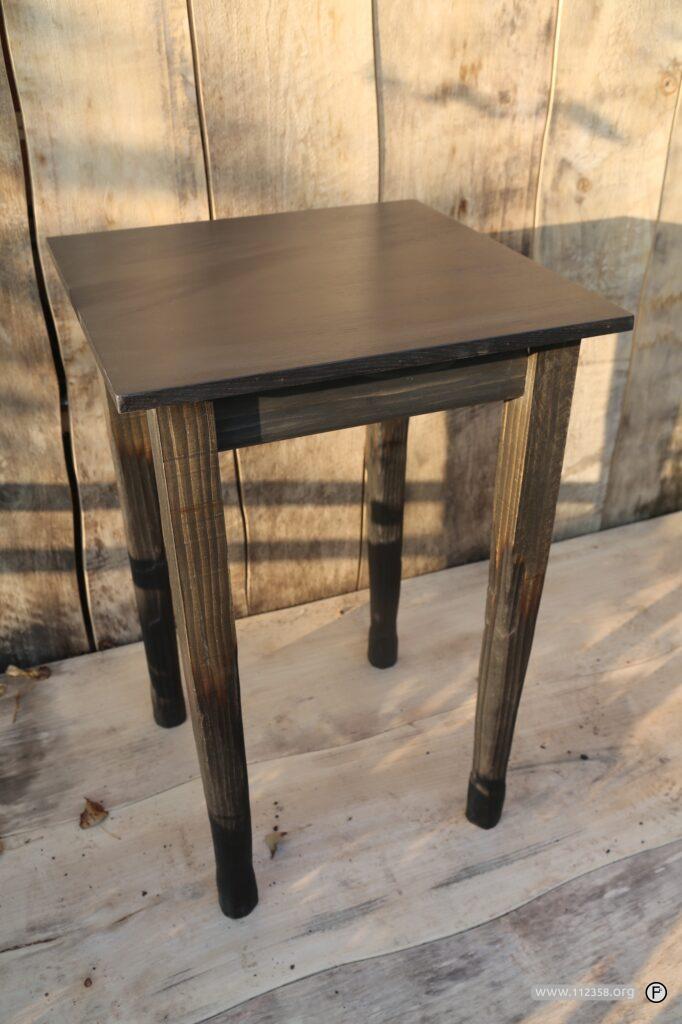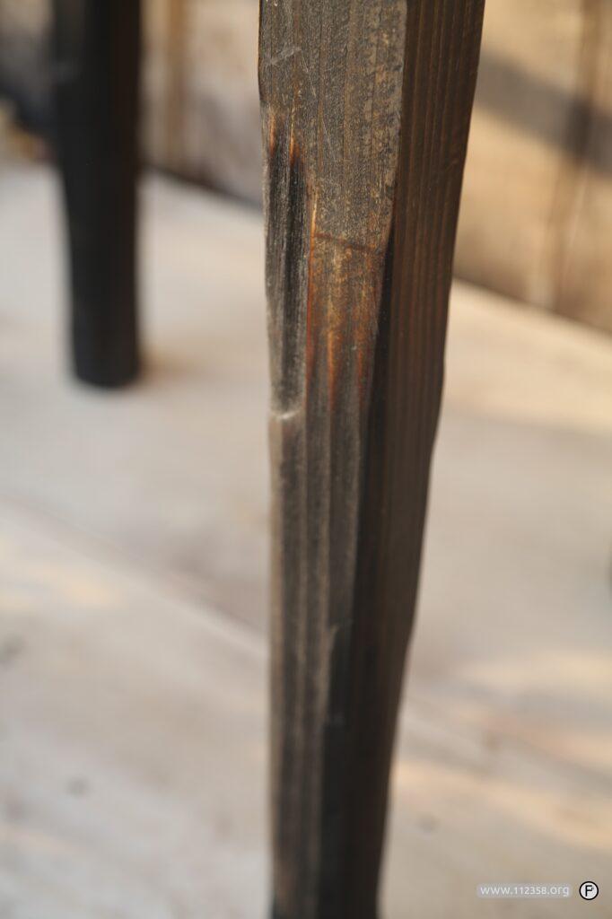 Blat z klejonego drewna fornirowany dębem. Przyciemniany amoniakiem, wyciągiem z orzecha i grafitem.