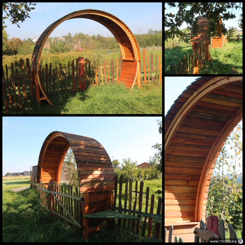 Brama stoi na końcu ogrodu, otwierając go na pobliskie łąki.