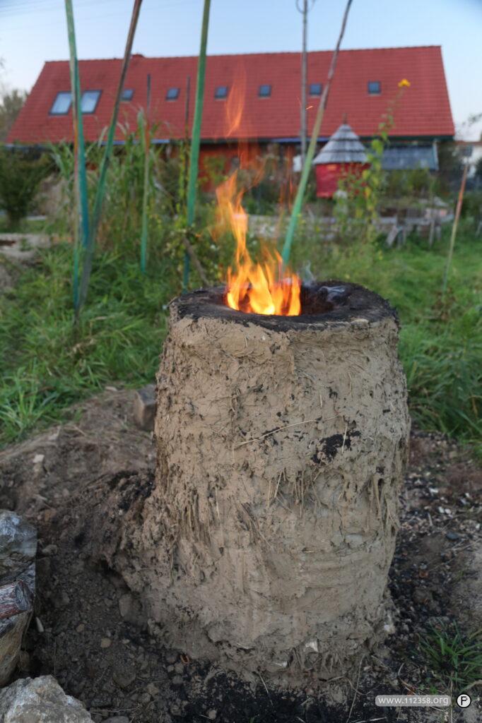 Piec napełnia się do samej góry drewnem i trocinami, wlot i wylot zatyka blachą i obsypuję ziemią, aby nie było dopływu powietrza.
