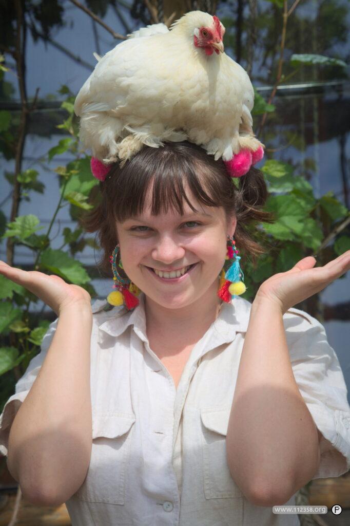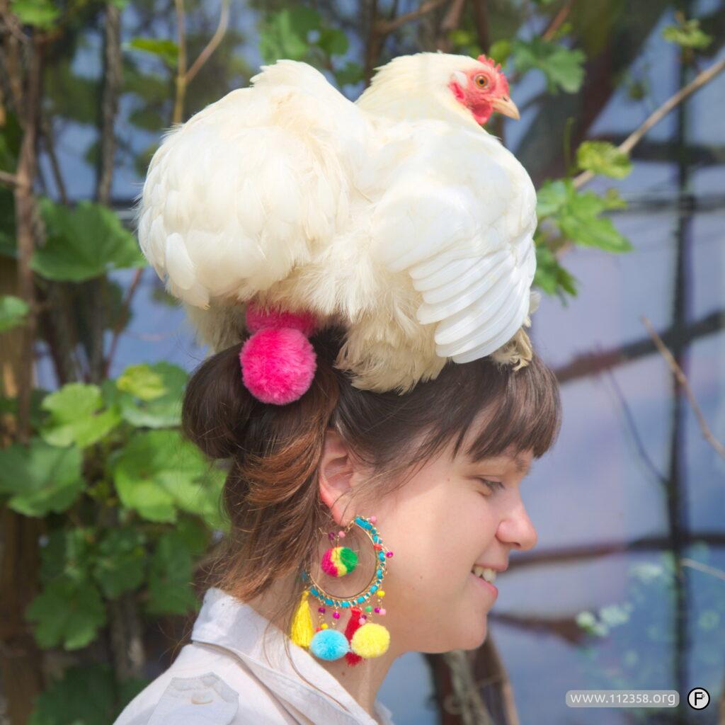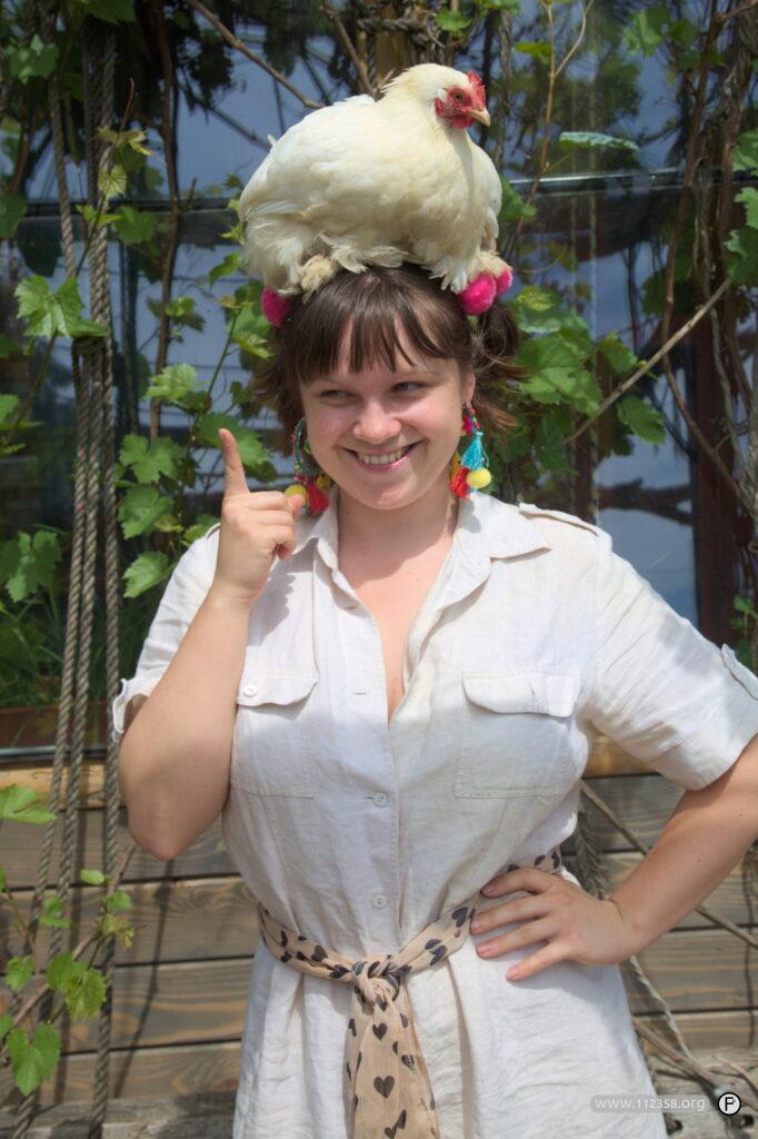 Patrycja przymierza kurzą czapkę, Kurka rasy kochin miniaturka zwana Pompon Delux.