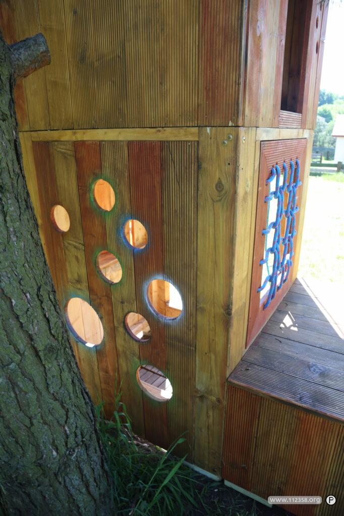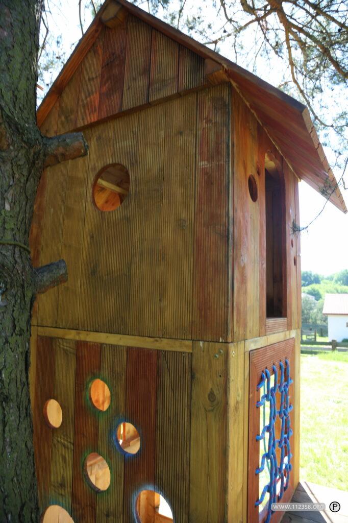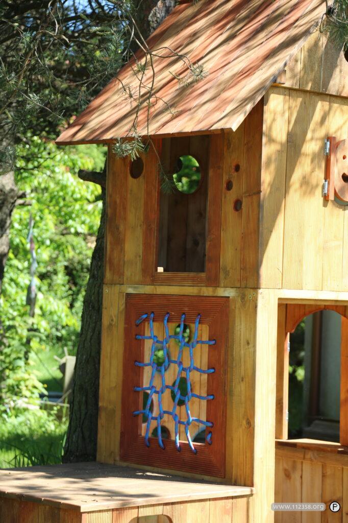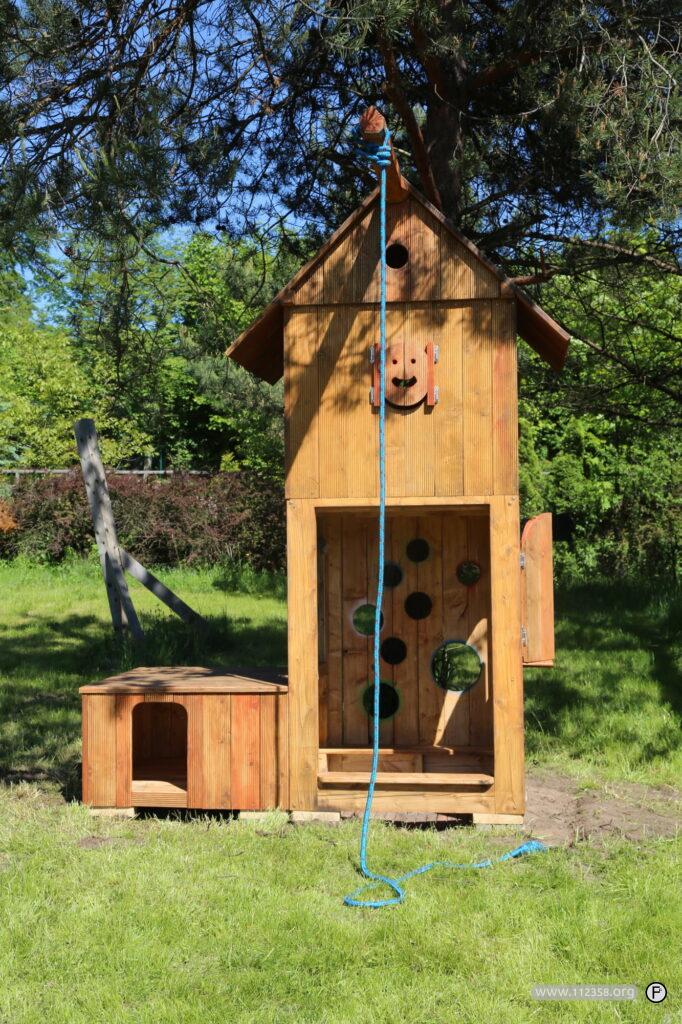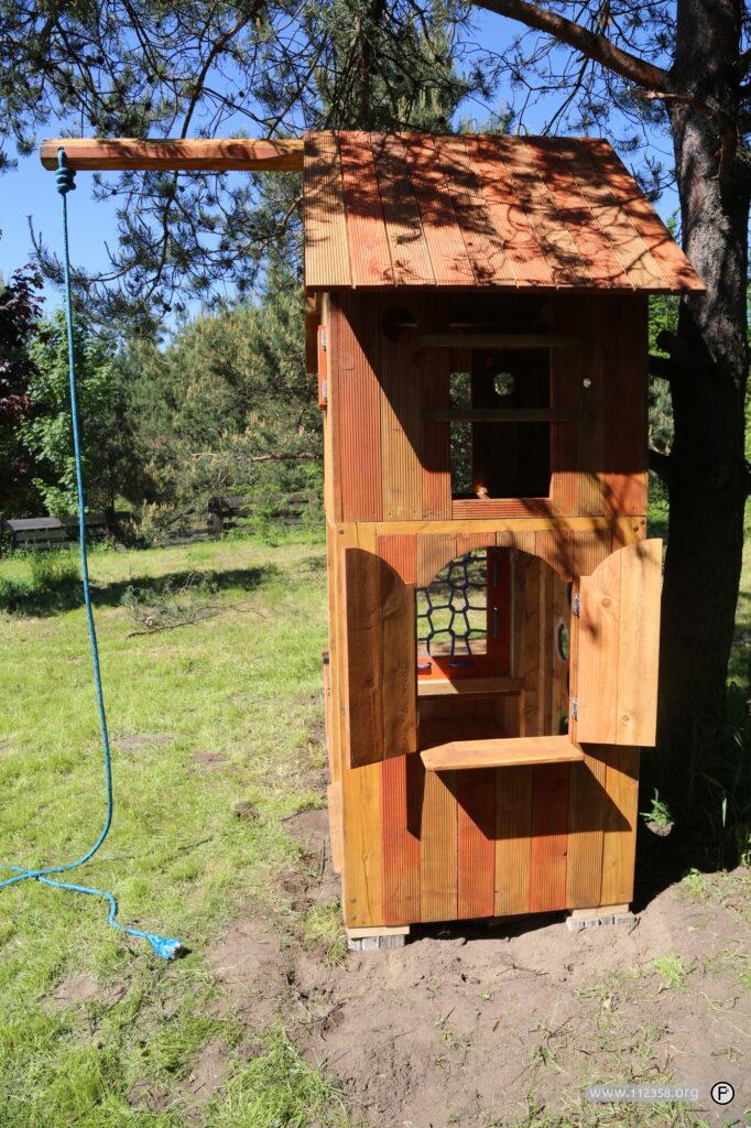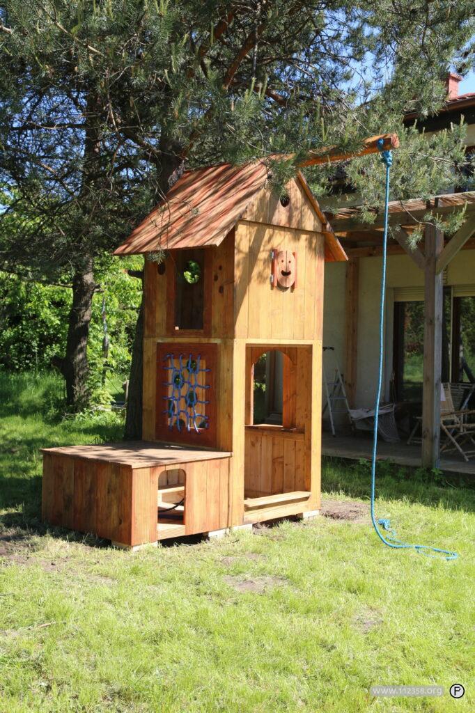 Drewniany piętrowy domek z zamykanymi oknami. Lina do bujania i siatka do wspinania. Domek jest zrobiony z ryflowanych desek tarasowych.