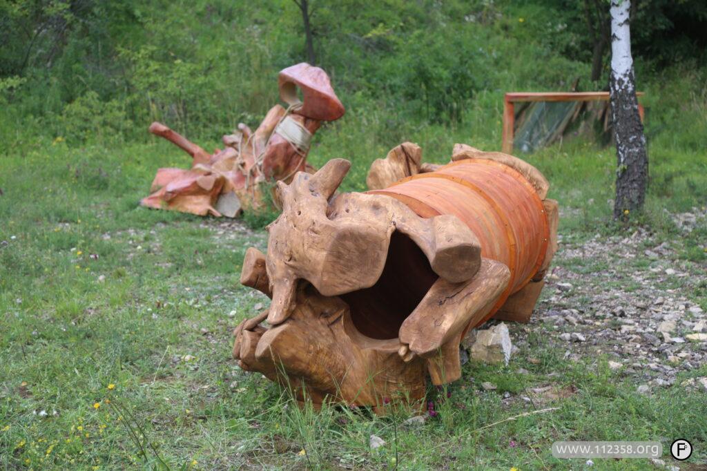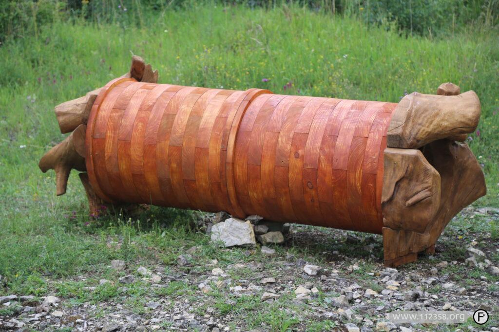 Wykonany jest z topoli, wejścia z korzeni a cegiełki wycinane z grubych desek.