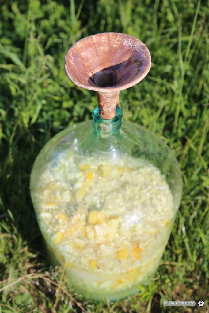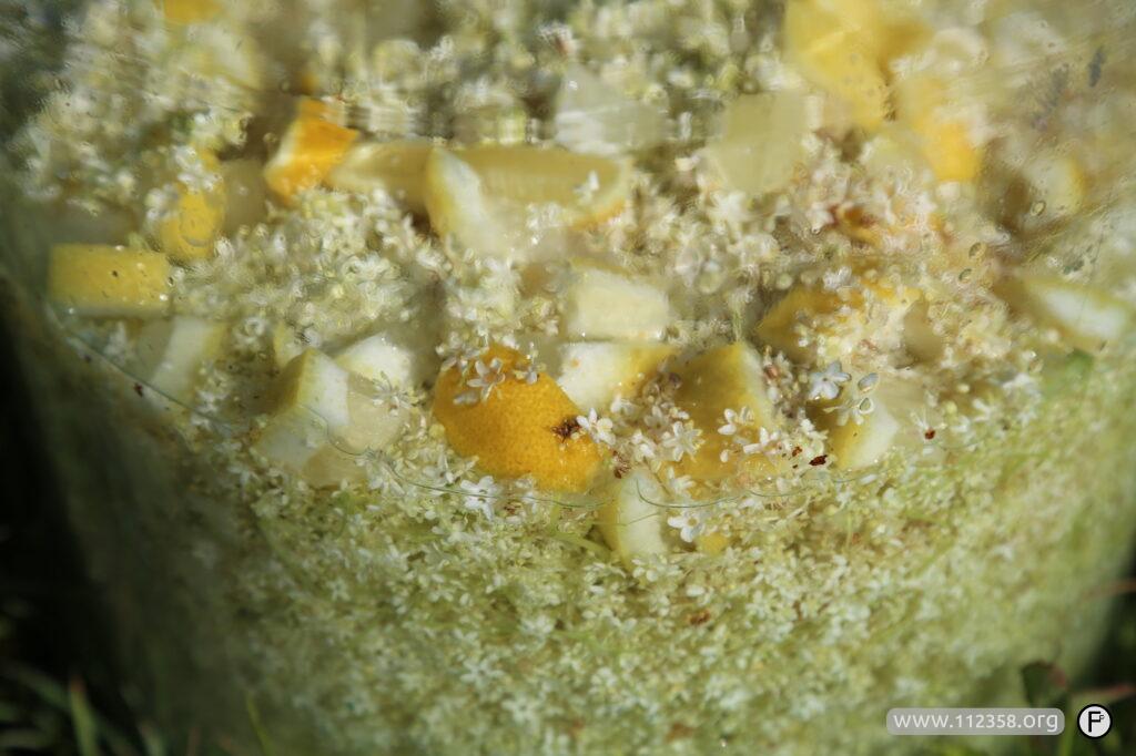 Kwiatami obranymi z łodyżek napełniamy dymion i zalewamy dobrą wodą z rozpuszczonym cukrem, dodajemy umyte i pokrojone cytryny i ewentualnie drożdże winne rozmnożone wcześniej.