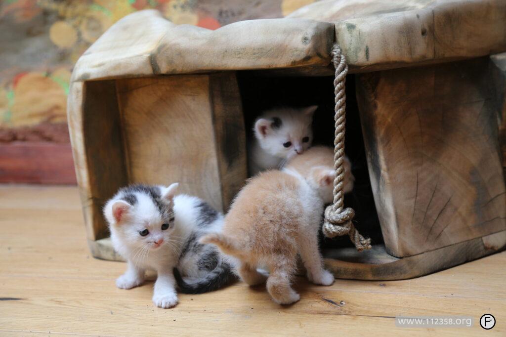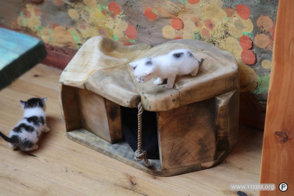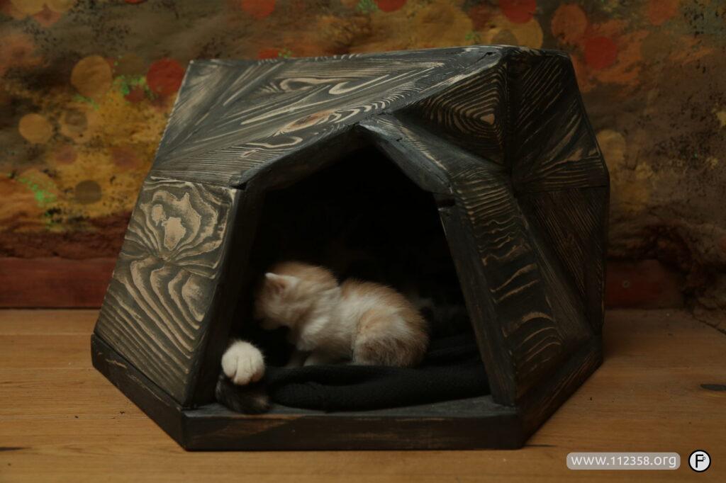 Domki testowane na żywych kotach. Koty ze zdjęcia są zbyt dzikie i mają więcej niż jedno miejsce do spania i odpoczywania.