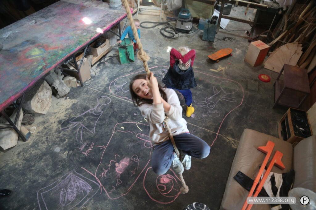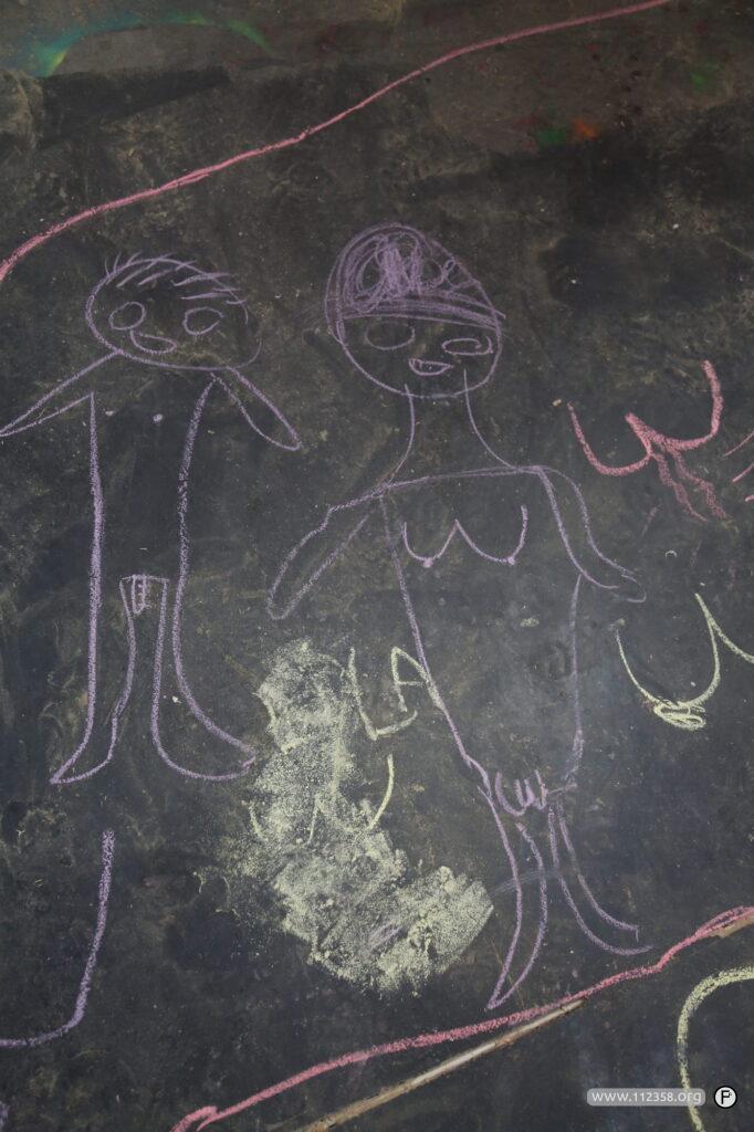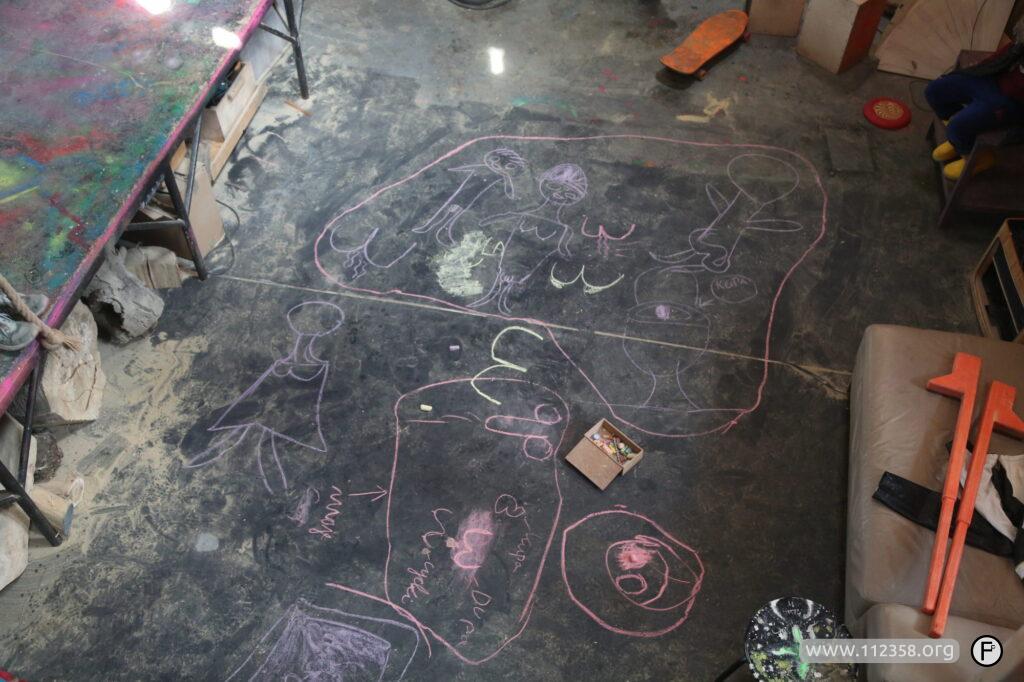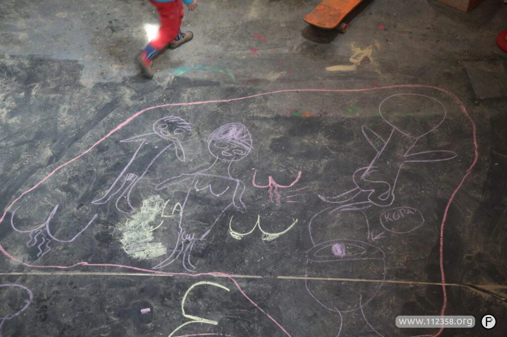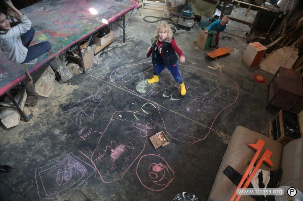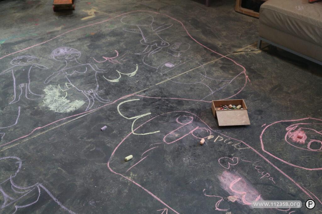 Rysunki kredą na podłodze pracowni. Dam wam kredę ale narysujcie coś żebym tego pożałował. o to efekty: Rysowali Lila Majka i Franek. Pindol dupa kupa