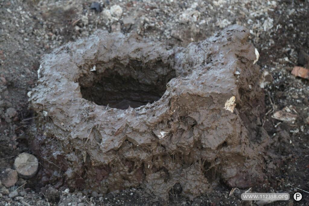 Pionowe ścianki jednakowej grubości budowałem do wysokości 90 cm. Każdą kolejną warstwę łączyłem sianem z poprzednią, dobrze to widać na zdjęciu, jak trawa z gliną spływa po ściankach.