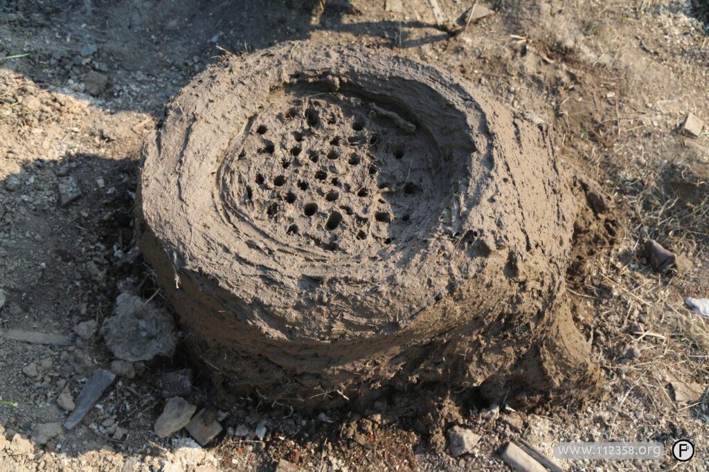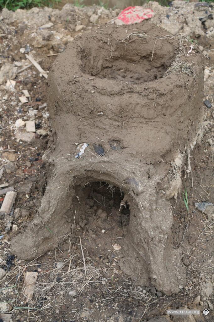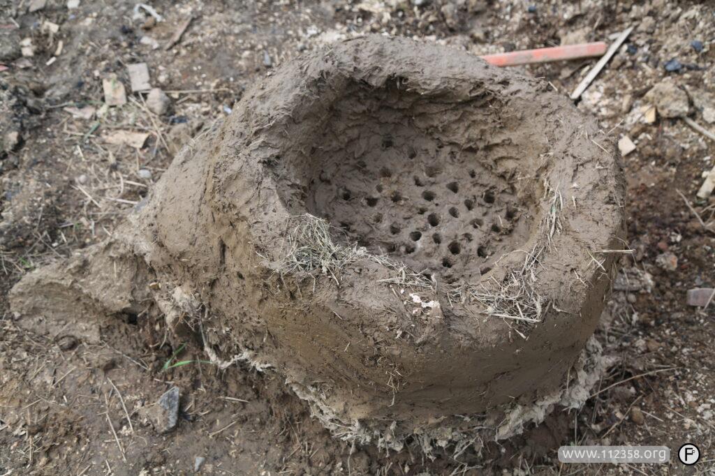 Najpierw zbudowałem konstrukcje z płaskich kamieni i fragmentów zepsutej ceramiki i cienkich listewek na to położyłem warstwę gliny z sianem (4 cm) i od razu porobiłem patykiem dziurki.