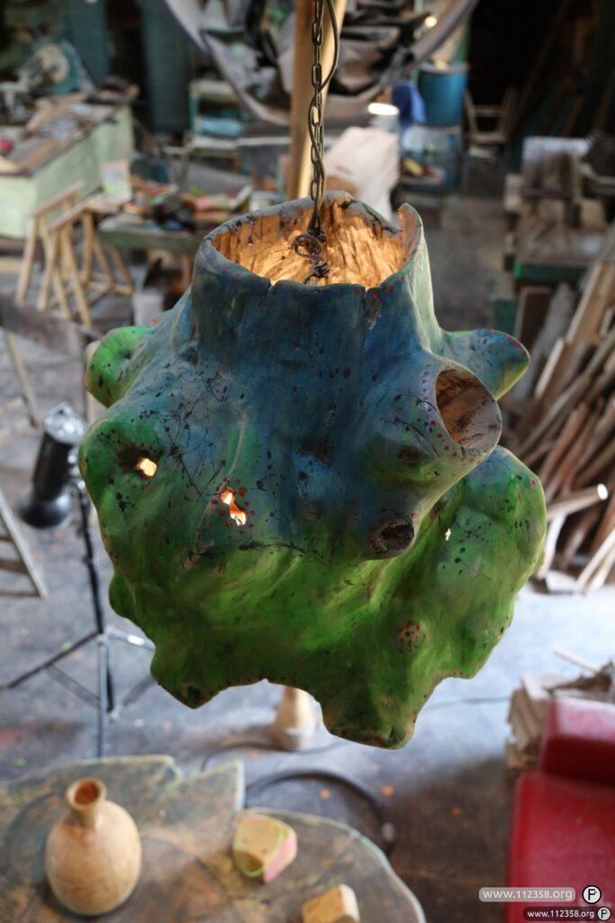 Lampa została zrobiona z dużego pnia topoli, najpierw wypaliliśmy środek saletrą. To co zostało, obrabialiśmy dłutami szlifierkami i innymi narzędziami.