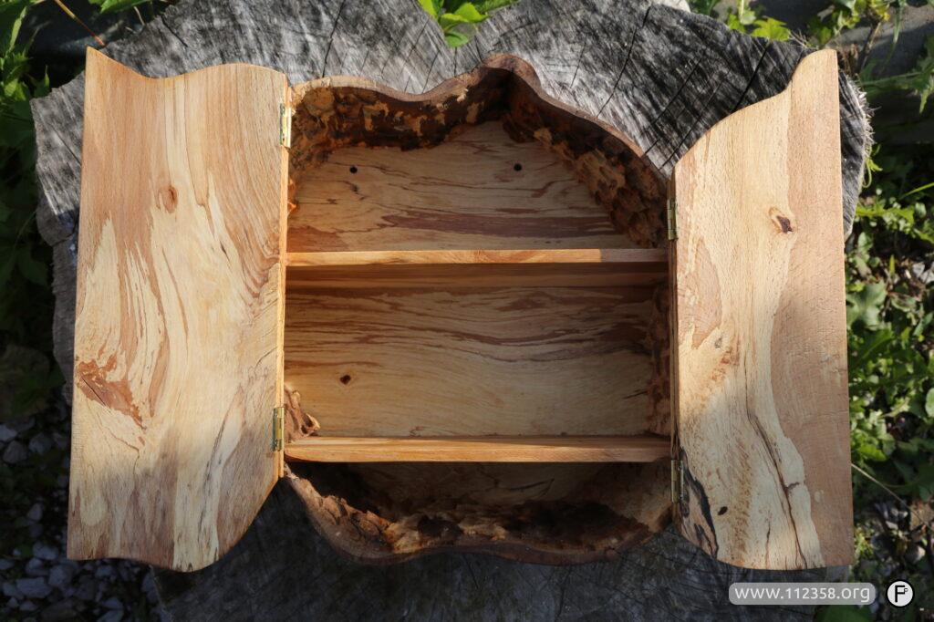 Te ciemne linie i przebarwienia to ślady grzybni. Szafka została wydrążona z pnia orzecha zwalonego przez wiatr.