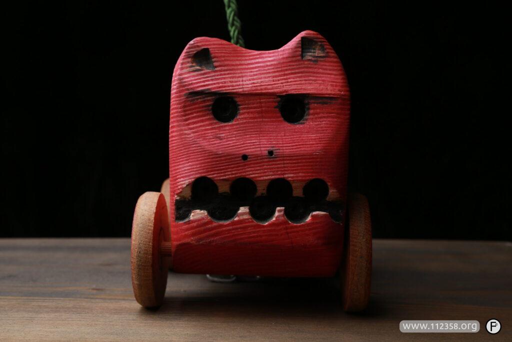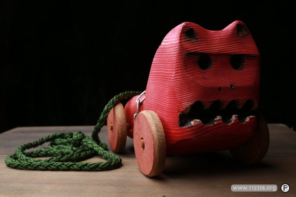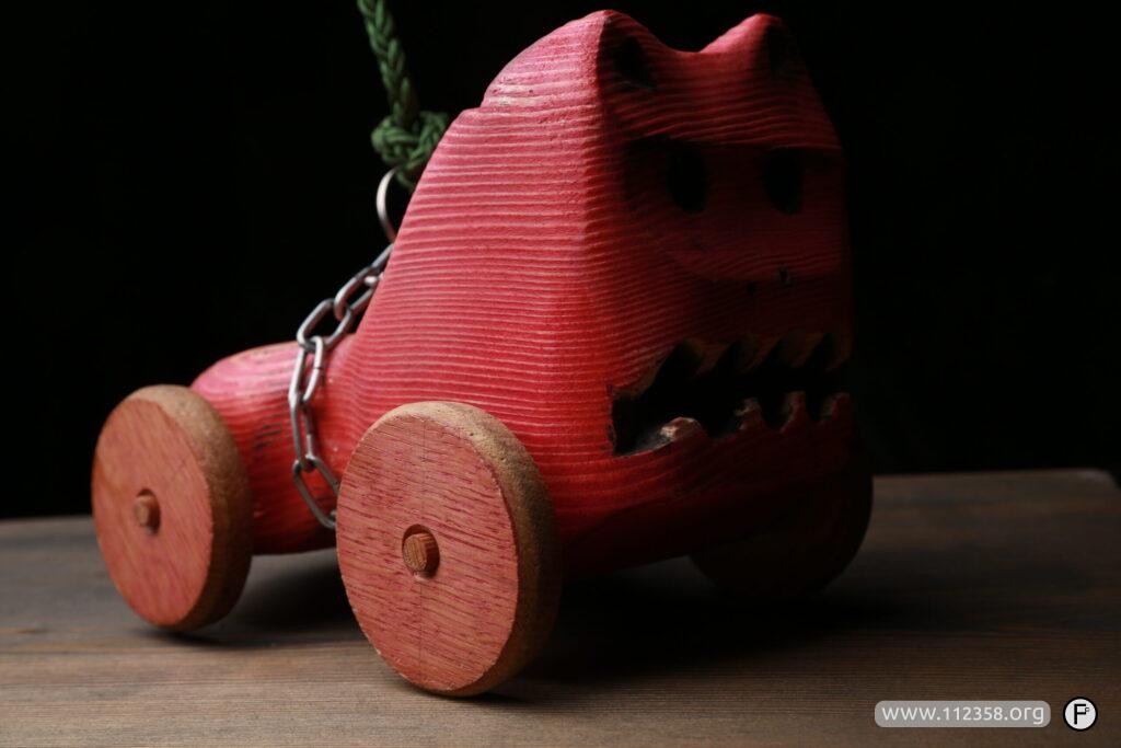 Żarłoczek ręcznie robiony drewniany pies na smyczy.